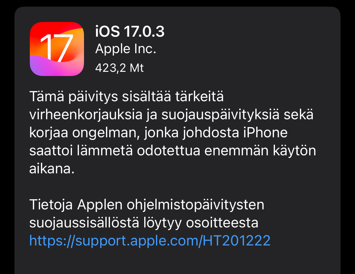 Ennen kaikkea iOS 17.0.3 korjaa Applen mukaan ”ongelman, jonka johdosta iPhone saattoi lämmetä odotettua enemmän käytön aikana”.