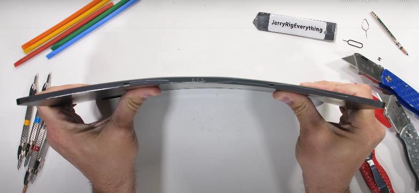 Galaxy Tab S8 Ultran alumiinivahvisteinen runko taipuu käsivoimin taitettaessa jonkin verran, mutta ei ollenkaan niin paljon kuin voisi kenties odottaa. Katki tablettia ei saa, videolla todetaan.